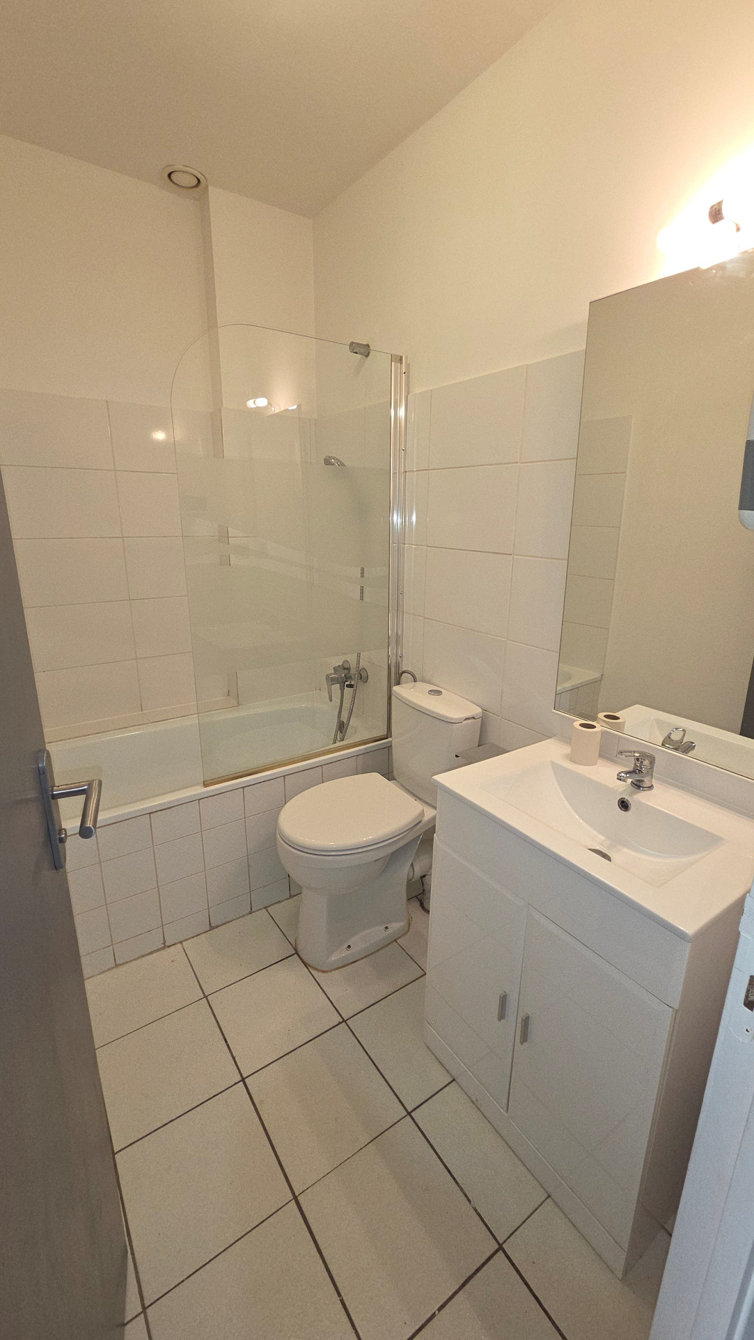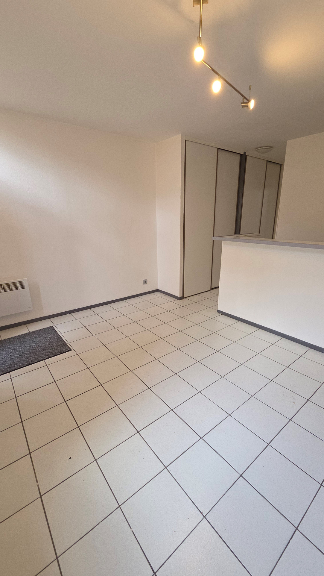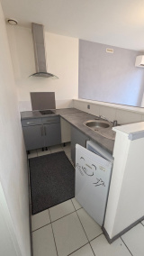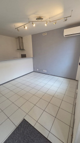 Une entrée directe sur séjour avec cuisine américaine équipée, deux grands placards, une salle de bains avec wc, une chambre séparée